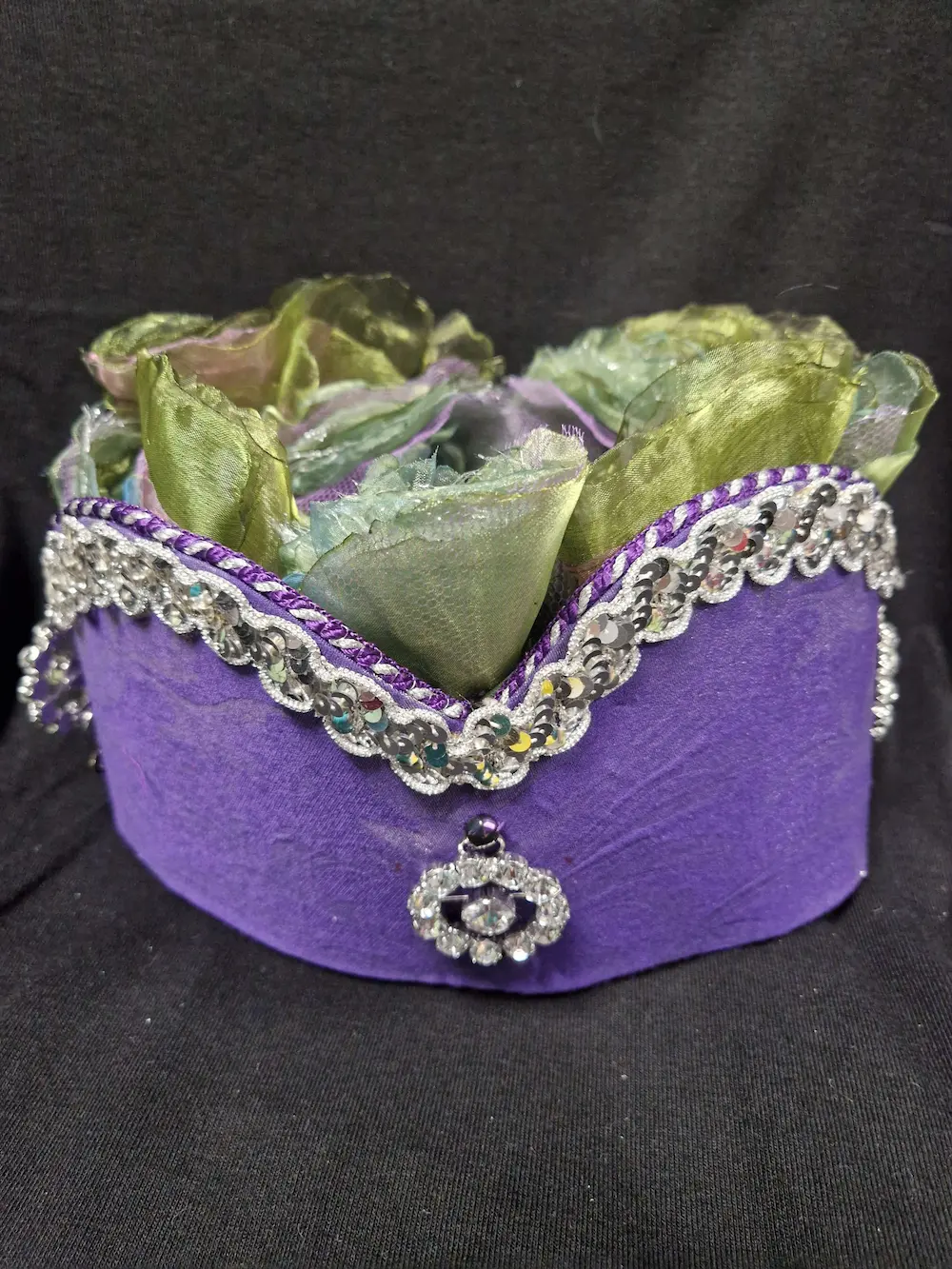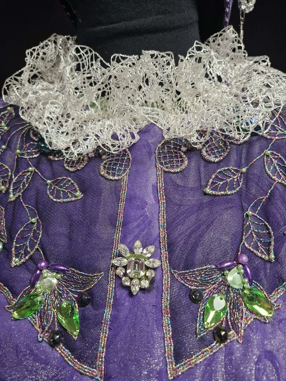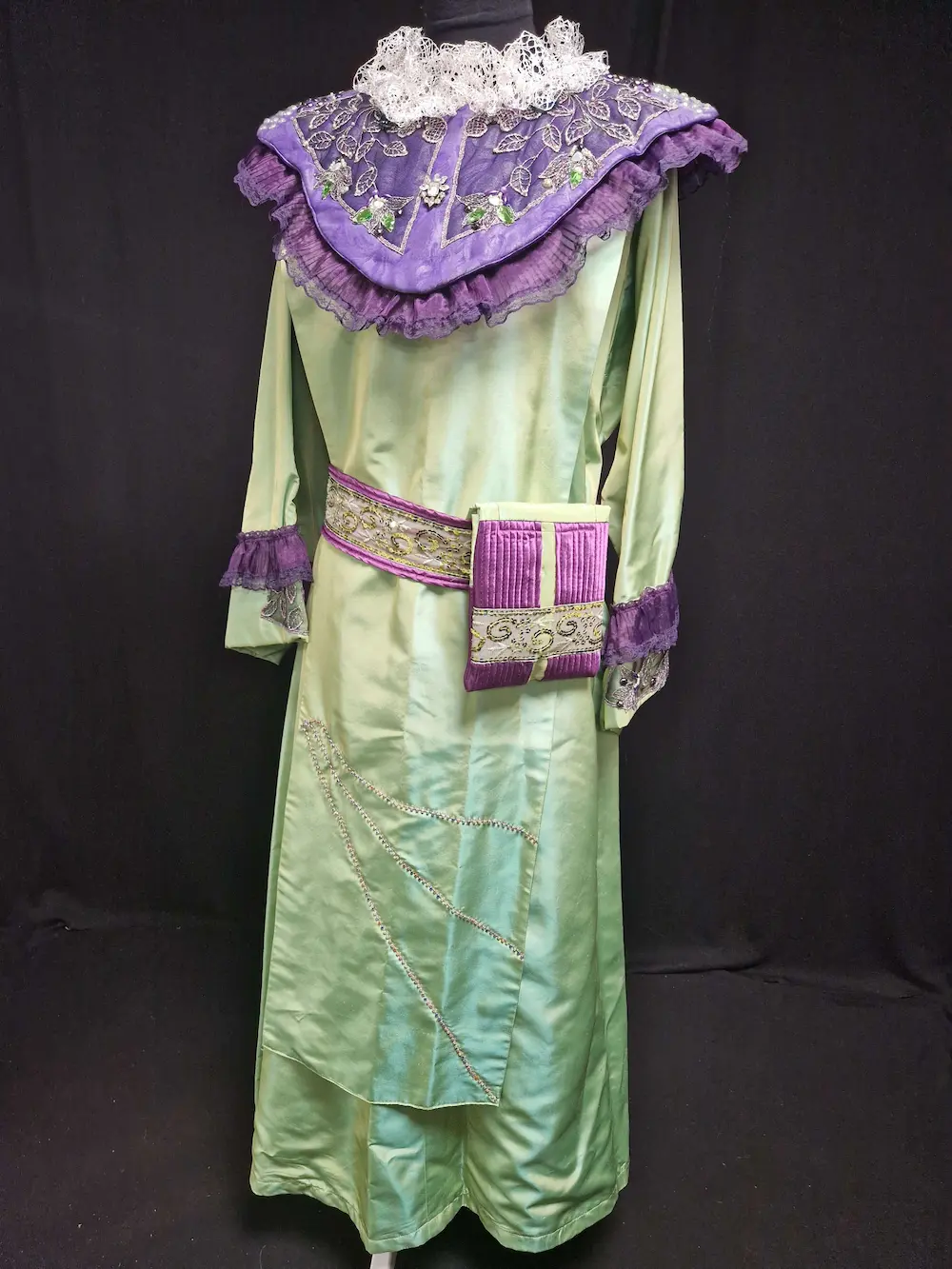 Costume carnaval vénitien composé d’une robe longue en taffetas vert jade recouverte d’une chasuble décorée de pierres colorées, collerette amovible violette brodée avec pierreries se fermant par bouton pression, accompagné d’une coiffe et d’une ceinture avec pochette.