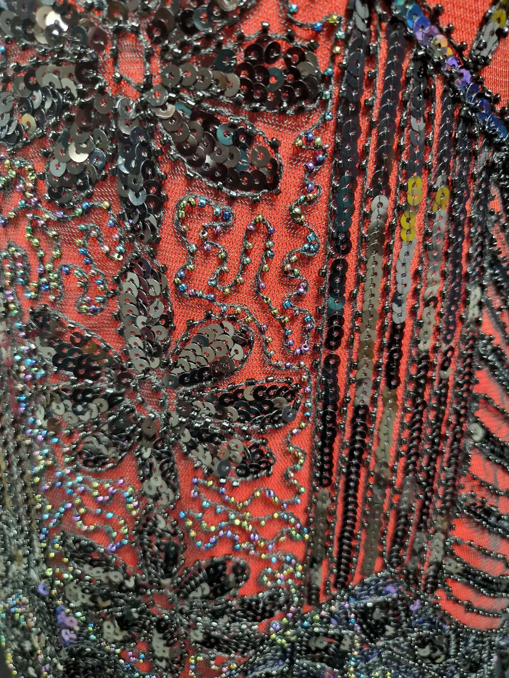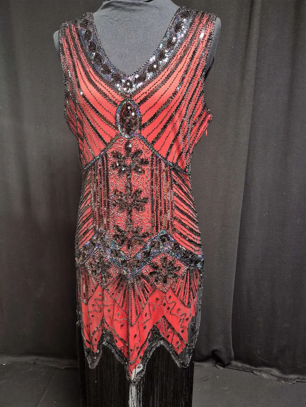 Robe inspiration année 1920 Charleston, couleur rouge avec perles, strass et franges, fermeture éclair dans le dos. Plusieurs coloris et tailles différentes disponibles.