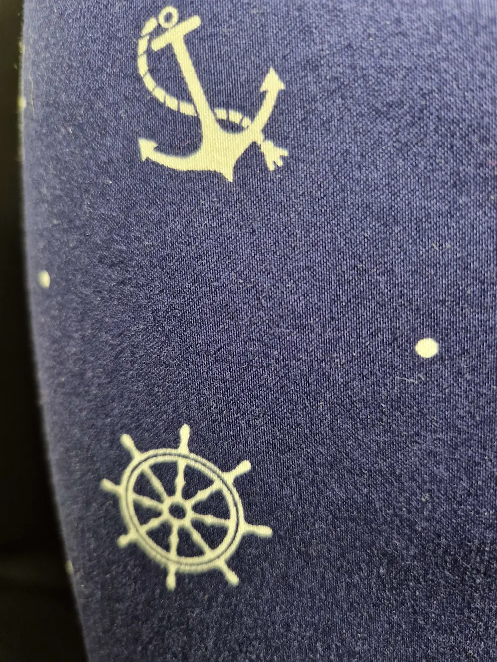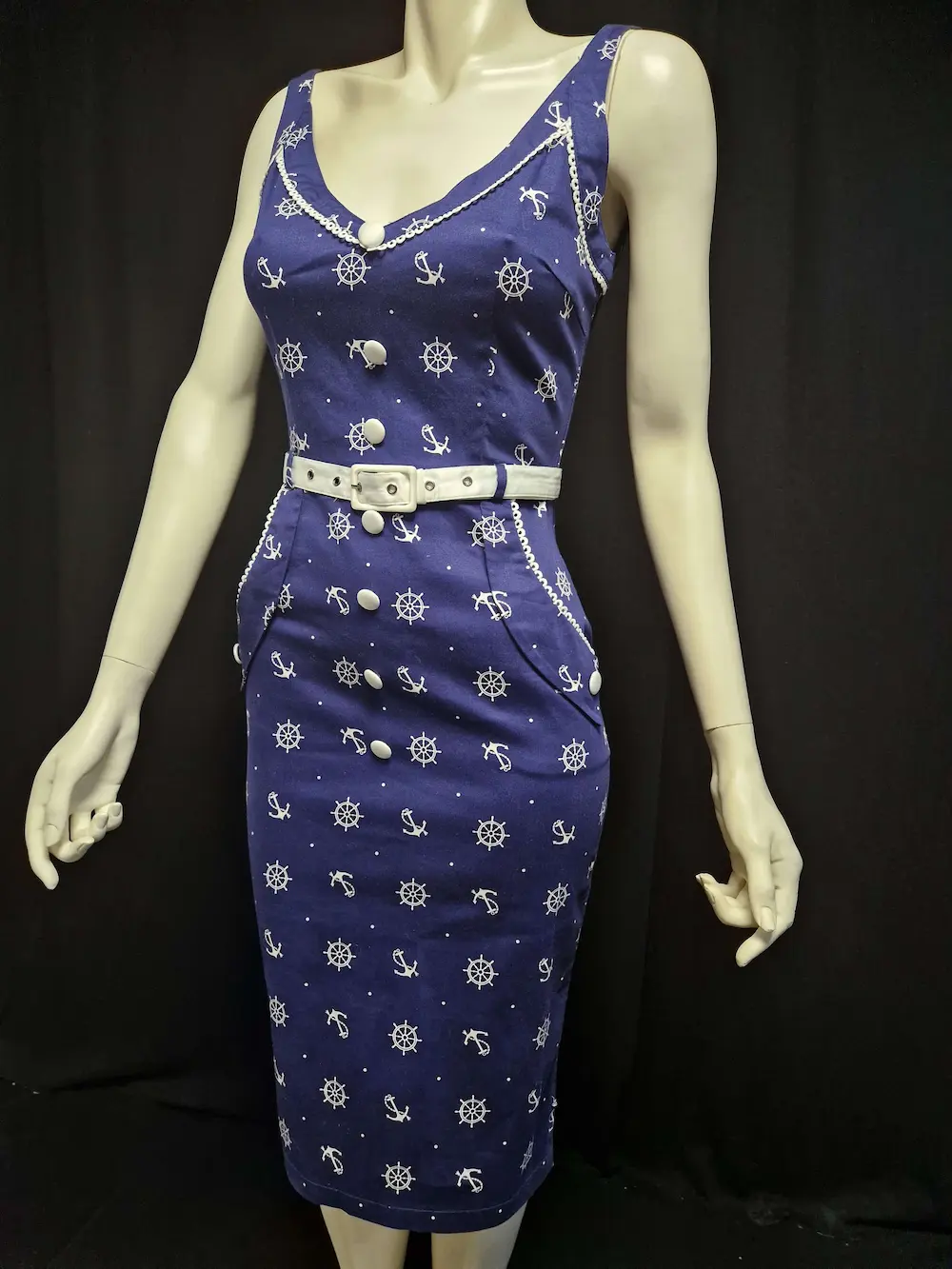 Robe années 50 pin-up, bleue avec motif marin, sans manches, ceinture en tissu blanc, boutons blancs décoratifs sur le devant, fermeture éclair à l’arrière.