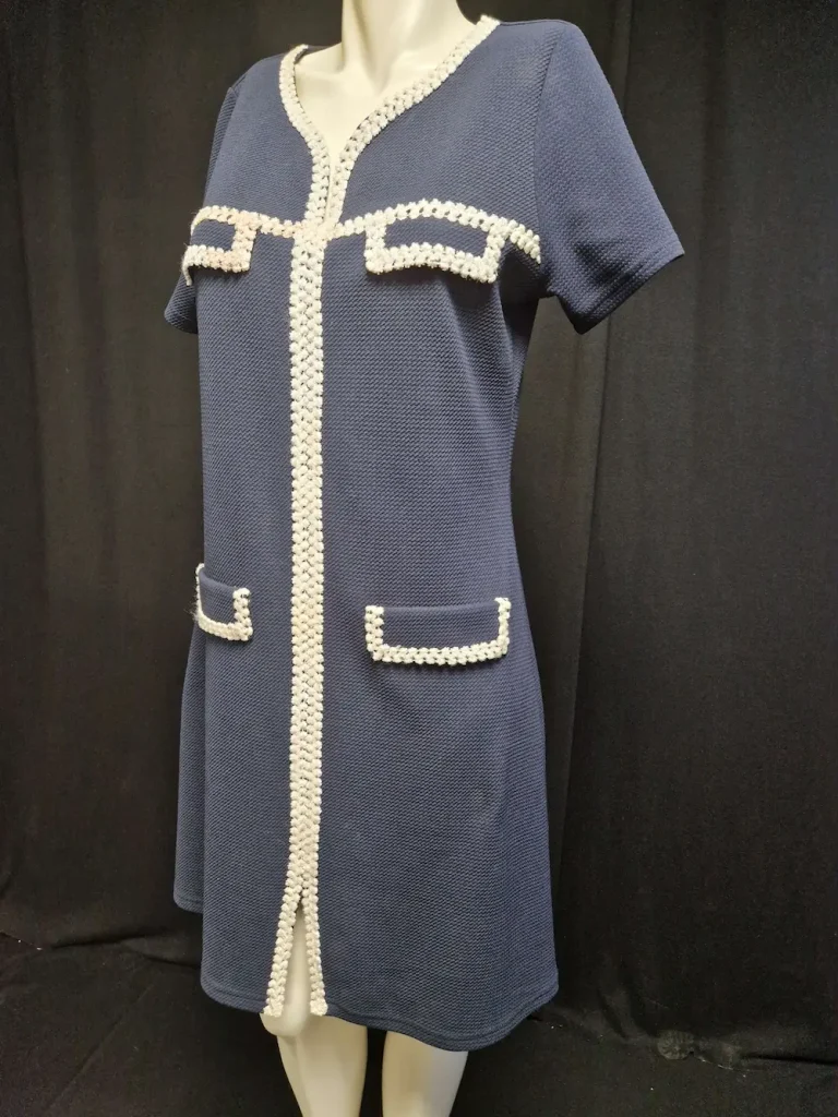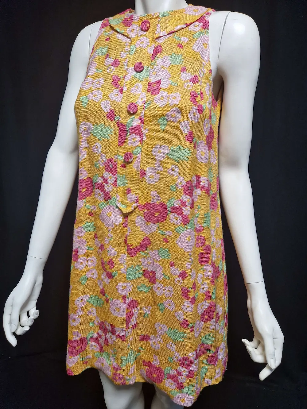 Véritable robe des années 60 jaune avec motif floral, sans manches, boutons décoratifs recouverts de tissu sur le devant, fermeture éclair à l’arrière.